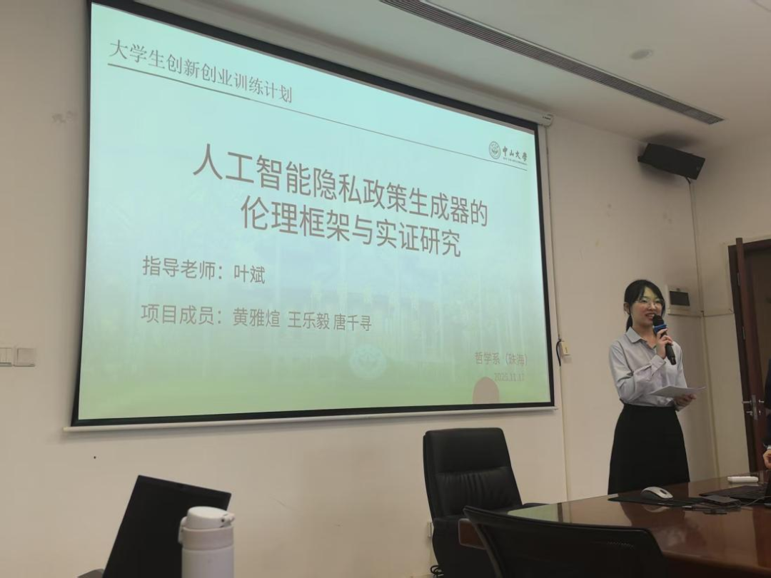 在学术探索的道路上,她尝试将哲学理论与现实问题相结合。作为2025年大创项目《人工智能隐私政策生成器的伦理框架构建与实证研究》的第一主持人,她带领团队聚焦AI技术发展中的隐私伦理问题,构建评估框架,通过实证研究探索规范路径,为AI隐私政策的合规性与透明度提供理论参考,力图推动技术发展与伦理规范的平衡。