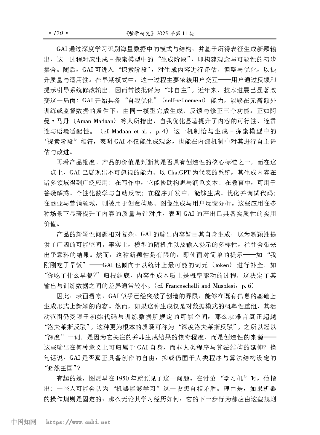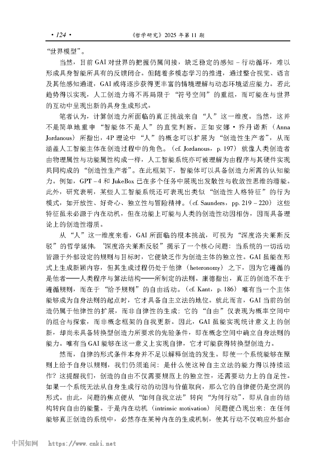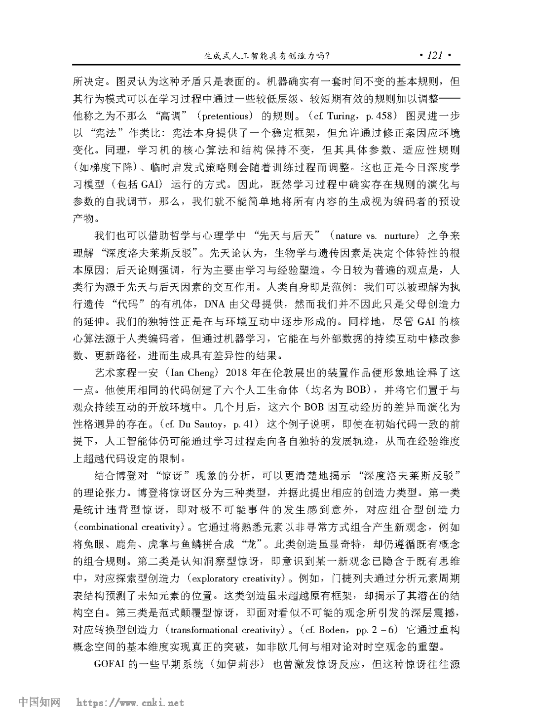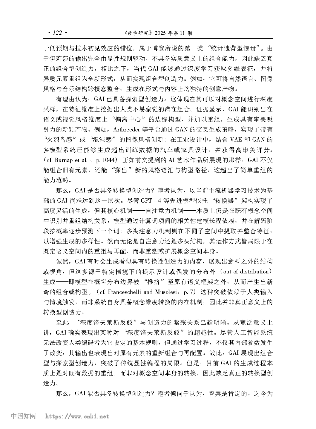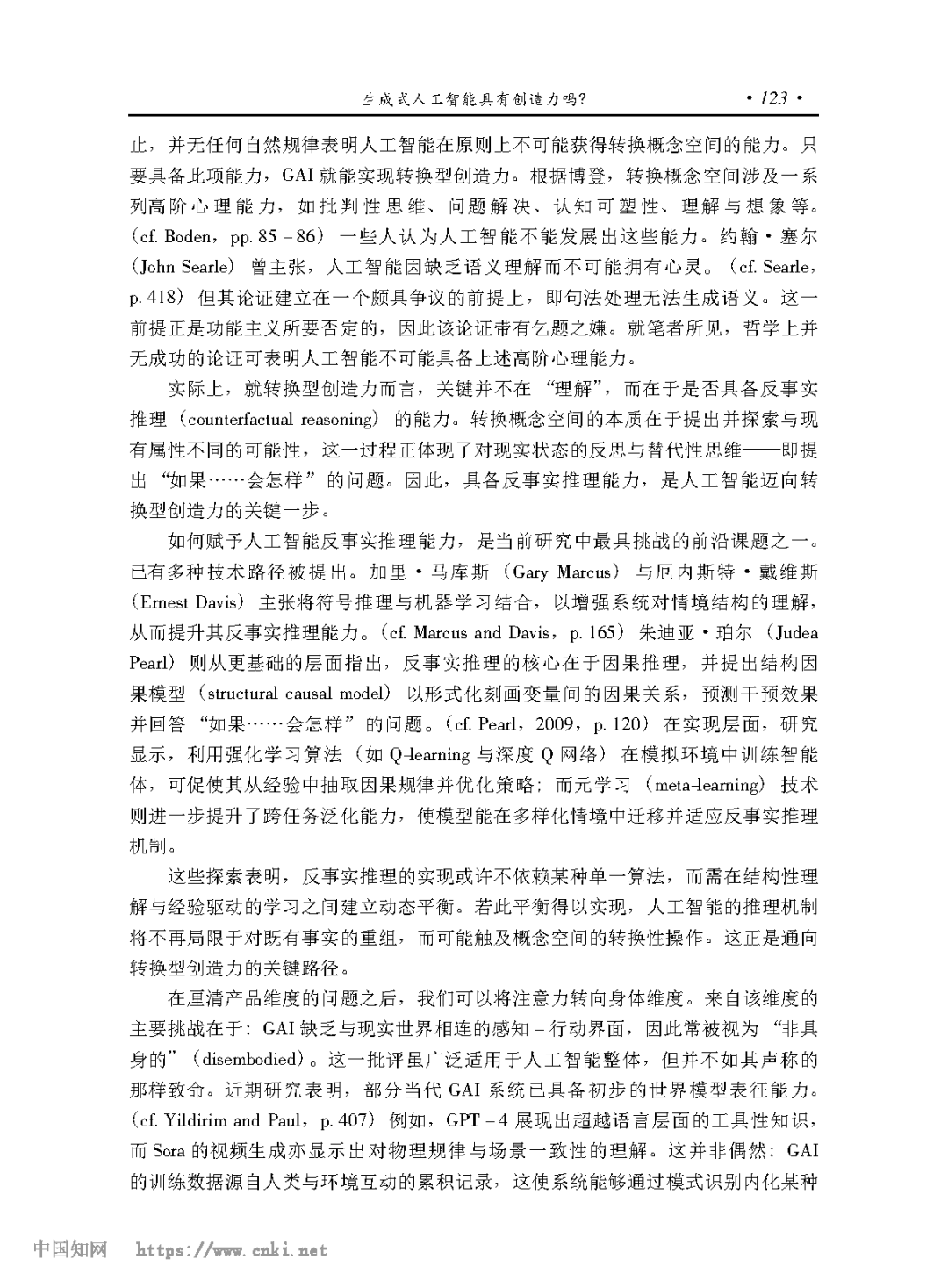 [摘要] 计算创造力致力于让人工智能表现出创造力。好的老式人工智能的技术属性决定了它们无法超越 “洛夫莱斯反驳”,不可能有真正的创造力。目前的生成式人工智能可以通过宽泛意义上的 “深度洛夫莱斯反驳”,有可能具有组合型和探索型创造力,但它们无法超越严格意义上的 “深度洛夫莱斯反驳”,不可能有转换型创造力。要使人工智能具备转换型创造力,不但需要赋予其反事实推理能力,以实现概念空间的转换,更需使其具备生成经验关系的结构性机制,从而在内在调节与价值生成中获得自主创造的动力。