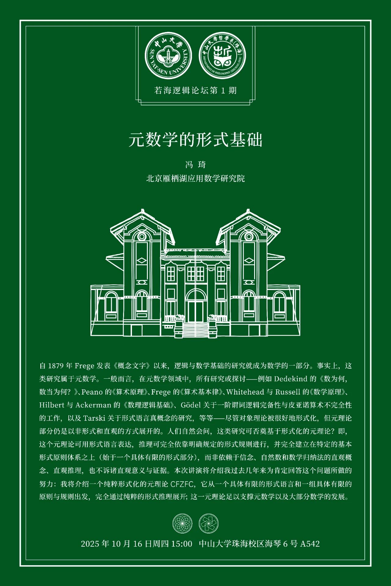 自 1879 年 Frege 发表《概念文字》以来,逻辑与数学基础的研究就成为数学的一部分。事实上,这类研究属于元数学。一般而言,在元数学领域中,所有研究或探讨——例如 Dedekind 的《数为何,数当为何?》、Peano 的《算术原理》、Frege 的《算术基本律》、Whitehead 与 Russell 的《数学原理》、Hilbert 与 Ackerman 的《数理逻辑基础》、Gödel 关于一阶谓词逻辑完备性与皮亚诺算术不完全性的工作,以及 Tarski 关于形式语言真概念的研究,等等——尽管对象理论被很好地形式化,但元理论部分仍是以非形式和直观的方式展开的。人们自然会问,这类研究可否奠基于形式化的元理论?即,这个元理论可用形式语言表达,推理可完全依靠明确规定的形式规则进行,并完全建立在特定的基本形式原则体系之上(始于一个具体有限的形式部分),而非依赖于信念、自然数和数学归纳法的直观概念、直观推理,也不诉诸直观意义与证据。本次讲演将介绍我过去几年来为肯定回答这个问题所做的努力:我将介绍一个纯粹形式化的元理论 CFZFC,它从一个具体有限的形式语言和一组具体有限的原则与规则出发,完全通过纯粹的形式推理展开;这一元理论足以支撑元数学以及大部分数学的发展。